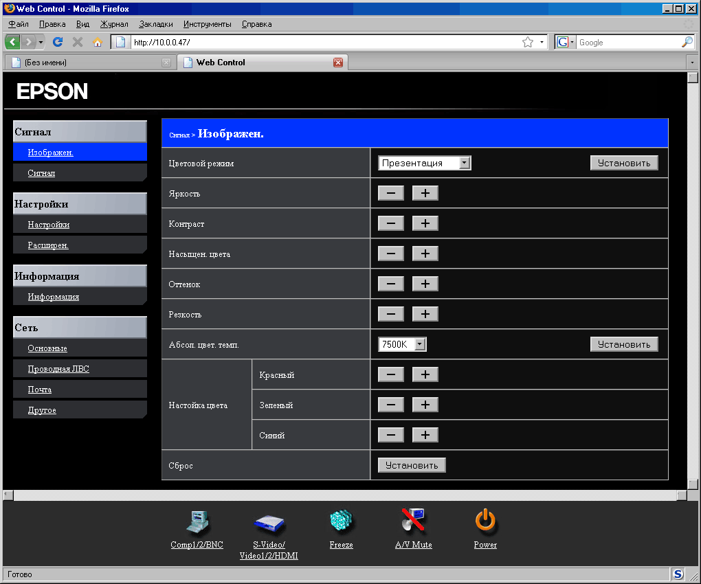 Проектор допускает дистанционное управление по интерфейсу RS-232 (имеется стандартный разъем D-sub 9 pin). Кроме того, проектор можно включить в сеть Ethernet, что позволит по сети управлять проектором и контролировать его состояние как с помощью фирменной программы EMP Monitor (в комплекте была V4.22), так и с помощью любого WEB-браузера, обратившись к встроенному в проектор HTTP-серверу.