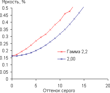Для оценки характера роста яркости на шкале серого мы измерили яркость в 16-ти точках на шкале серого для трех значений параметра Гамма (в скобках приведено значение показателя аппроксимирующей функции):