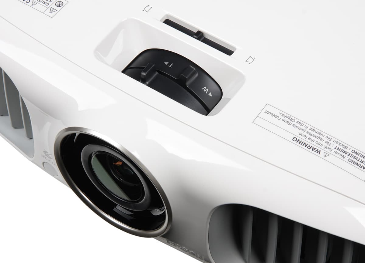 Фокусировка изображения и изменение фокусного расстояния на экране осуществляются двумя воротками на объективе, выглядывающими из ниши на верхней панели. В проекторе есть функция цифровой коррекции вертикальных и горизонтальных трапецеидальных искажений.