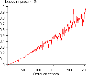 График ниже показывает прирост (не абсолютное значение!) яркости между соседними полутонами, полученный при последовательном выводе 256 оттенков серого (от 0, 0, 0 до 255, 255, 255) при Гамма = 0: