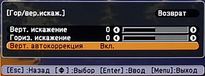 В проекторе есть функция цифровой коррекции вертикальных (±45 градусов) и горизонтальных (±30 градусов) трапецеидальных искажений.