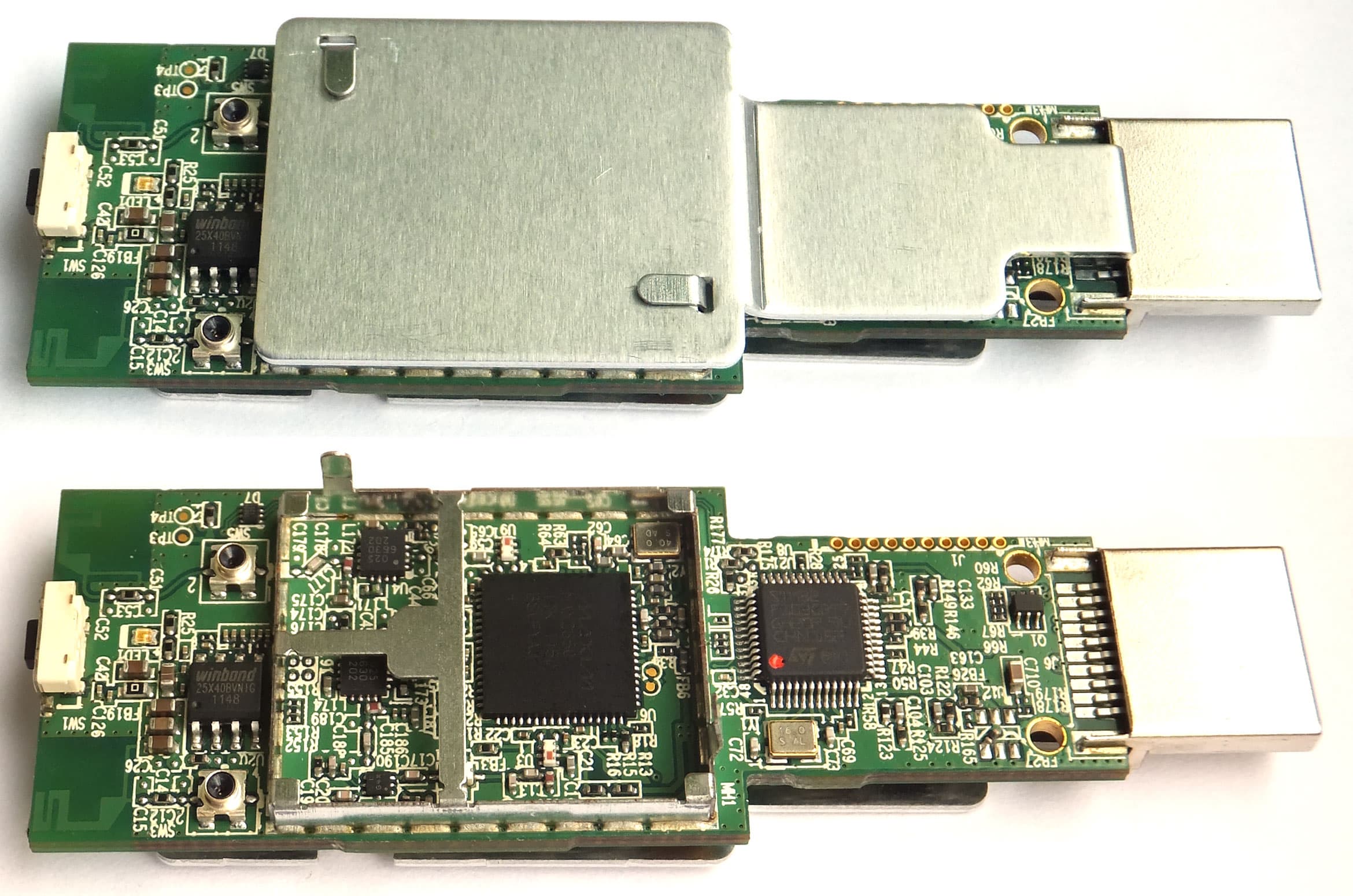 В торце «флэшки» виднеется кнопка, установленная вровень с корпусом. Эта кнопка иногда требуется для принудительного установления связи с передатчиком. Такие случаи могут возникнуть, если, к примеру, во время сеанса связи передатчик окажется вне досягаемости приёмника и произойдёт разрыв связи. Тут почти наверняка потребуется нажать данную кнопку, чтобы принудительно восстановить соединение.