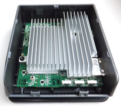 Бока устройства напоминают дуршлаг — сплошные вентиляционные отверстия. Они здесь отнюдь не для красоты. Дело в том, что корпус устройства может нагреваться во время работы аж до 65 °C (измерялось при комнатной температуре). Откуда такой нагрев? Ответ очевиден: издержки миниатюризации. C обеих сторон печатная плата заэкранирована металлическими кожухами, которые легко снимаются, если отогнуть ножки. Под кожухами видны те самые компоненты, виновные в столь сильном нагреве.