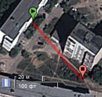 Наконец, расскажем об одной из самых главных особенностей рассматриваемых гаджетов, а именно: о расстоянии, на которое способен передаваться сигнал. Для проверки этого мы соорудили этакую походную станцию, состоящую из смартфона с HDMI-выходом, передатчика, подключённого к данному выходу, и пятивольтовой мобильной аккумуляторной батареи, дающей в точности такой ток, который присутствует в USB-портах устройств. Приёмник в это время располагался на подоконнике, так, чтобы металлическая рама окна не загораживала сигнал. Отойдя на приличное расстояние от окна, в котором виднеется приёмник, мы убедились в наличии уверенной связи между устройствами. Снова отошли, опять убедились… И ещё отошли, и ещё… Видимо, сыграл фактор привычки — ведь похожие устройства уже тестировались нами точно таким же способом. Помнится, максимальное расстояние на прямой видимости, при котором сигнал уверенно держался, составило всего лишь 15-20 метров. Однако в данном случае максимальное расстояние превысило результат тех прежних устройств более чем вдвое, составив 55 метров! Для наглядности ниже приведён снимок местности, сделанный со спутника, — красной линией показана траектория и расстояние, на котором оба устройства продолжали держать уверенную связь. Трудно сказать, какую роль здесь играла погода, которая во время нашего похода была по-осеннему отвратительной: полудождь/полуснег с резкими порывами ветра.