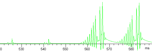 На графике присутствуют 4 группы импульсов — 2 соответствуют черному полю (2 кадра), 2 — белому (тоже 2 кадра). Черные участки панели специально немного подсвечиваются, чтобы газ в ячейках всегда находился в активном состоянии. То есть черный цвет у PDP имеет некую минимальную яркость — об этом свидетельствуют группы импульсов на черных кадрах. Группы импульсов белых полей демонстрируют способ формирования градаций оттенков — каждый оттенок формируется определенным набором импульсов, различающихся по амплитуде. На самом деле, каждый из этих импульсов, скорее всего, состоит из различного количества очень коротких импульсов одинаковой амплитуды, но наша аппаратура не способна их различить.