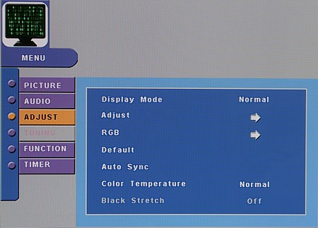 Настроек изображения немного: контрастность, яркость, насыщенность, оттенок (для NTSC), контурная резкость, цветовая температура (4 профиля) и, для VGA-подключения, настройка интенсивностей красного, синего и зеленого цветов. Кроме того, можно включить режим подавления видеошумов (три градации плюс автоматический выбор уровня) и автоматическую подстройку контрастности (Black Stretch).