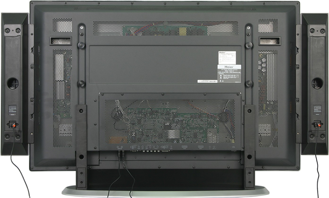 В комплекте с телевизором поставляется подставка, состоящая из нескольких частей. В собранном виде подставка представляет собой прочную жесткую конструкцию, телевизор стоит на ней очень устойчиво, строго перпендикулярно основанию и на фиксированной высоте. Для настенного монтажа на задней панели есть несколько резьбовых отверстий. Два выреза на задней панели позволяют удобно ухватить панель при транспортировке. В комплекте поставки есть две узкие колонки, дизайн которых выдержан в стиле самого телевизора. Корпус колонок изготовлен из пластмассы, к телевизору они прикручиваются парой саморезов каждая. Смонтированные на телевизоре колонки смотрятся несколько инородно, так как не совпадают по высоте с высотой корпуса телевизора. Впрочем, упрекать по этому поводу не стоит, так как колонки можно рассматривать в качестве бонуса. На самих колонках есть подпружиненные зажимы под оголенный провод, а ответные разъемы на телевизоре — это, как ни странно, пара RCA-разъемов.
