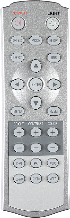 Пульт ДУ небольшой, в руке лежит удобно. Самые нужные кнопки расположены под большим пальцем и легко находятся на ощупь. Найти в темноте домашнего кинозала остальные кнопки поможет подсветка, включающаяся фосфоресцирующей кнопкой LIGHT. Отметим наличие кнопок для выбора источника сигнала (по одной на каждый видеовход) и кнопок +/-, с помощью которых меняется яркость, контрастность и насыщенность (в каком порядке они расположены, придется запомнить, так как подсвечиваются только «плюсы» и «минусы»).