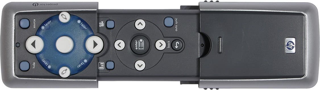 Пульт очень необычный — часть его корпуса сдвигается, открывая доступ к дополнительным кнопкам и, снизу, к крышке батарейного отсека. Кнопок немного, они разные по размерам и расположены так, что их очень легко находить на ощупь. Кнопка выключения питания находится на боку в углублении — случайно ее нажать трудно. Есть лазерная указка. Включается она нажатием на любое место голубого полупрозрачного диска, который при этом начинает светиться. Если компьютер соединен с проектором USB кабелем, идущим от разъема M1-D/A, и понимает HID-устройства, то джойстиком в центре голубого диска можно управлять курсором мыши, небольшие кнопочки с ее изображением эмулируют ее же кнопки, а большие со стрелками — Page Up / Down. То есть с пульта можно как просто перелистывать слайды презентации, так и выполнять нехитрые действия мышью.