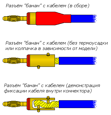 И, наконец, самый надёжный и «правильный» коннектор — тот, в котором кабель припаян хорошим припоем, а поверх него установлена термоусадка. Тут и площадь контакта большая и окисления нет. Так что если и будете использовать коннекторы «банан», то либо с пайкой, либо с обжимом, как описано в предыдущем абзаце. В этих случаях резон в использовании коннекторов есть.