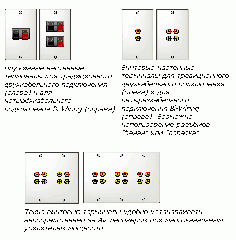 Такой блок оборудован либо винтовыми, либо пружинными терминалами. Аналогичные блоки можно разместить не только на стене за АС, но и на стене за ресивером или усилителем — кабели будут выглядеть эстетично и за стойкой с техникой тоже.
