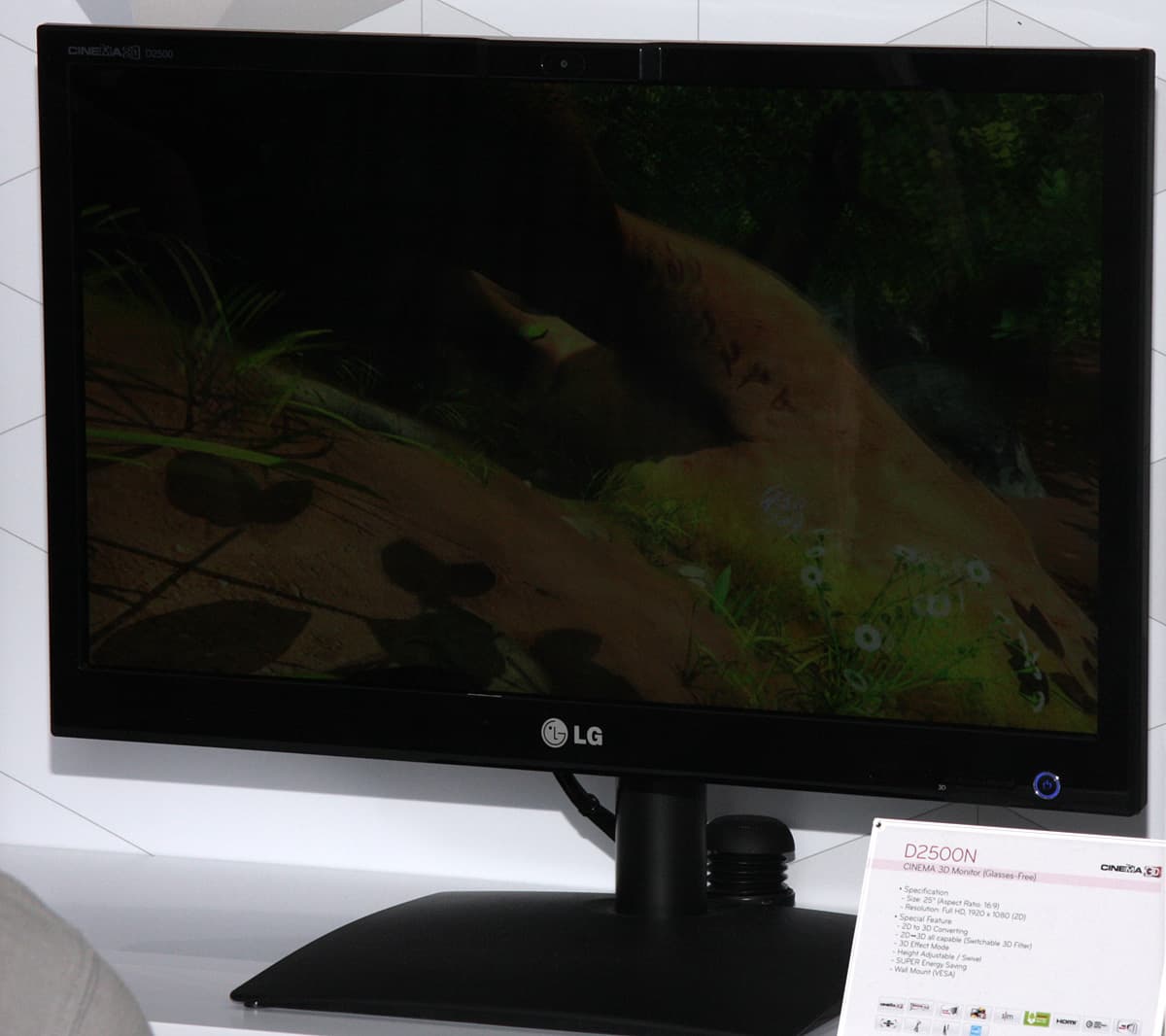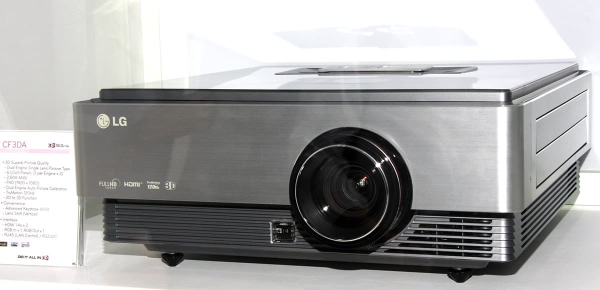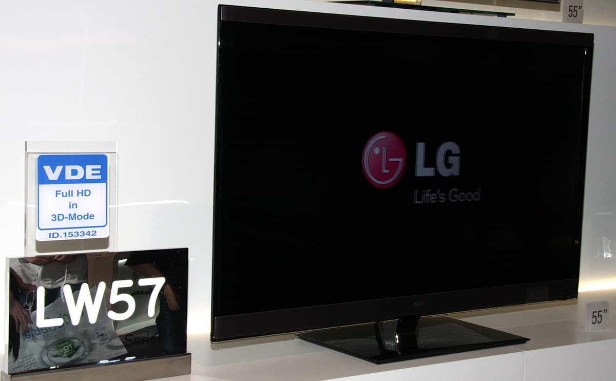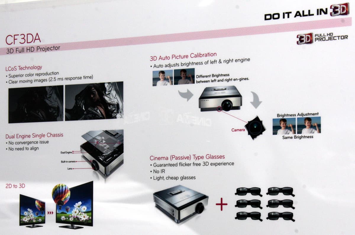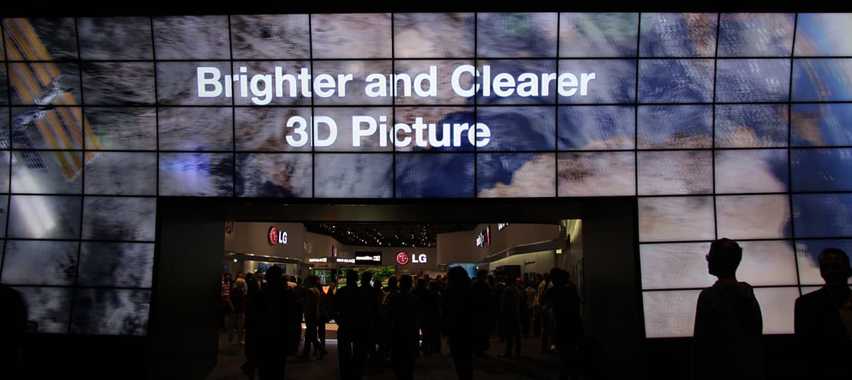Большинство посетителей тут же вставали как вкопанные, разевали рты и замирали на несколько минут. Прямое доказательство того, что размер имеет значение. Оправившись от шока, посетители шли дальше. При этом очки оставались на месте, на носу, так как по всему павильону LG были равномерно размещены телевизоры и мониторы, а в темном закутке и проектор, демонстрирующие 3D-картинку. Компания явно сделала основную ставку на использование поляризации для разделения ракурсов и, соответственно, на пассивные очки (метод последовательного вывода кадров остался только в плазменных телевизорах). В случае телевизоров и мониторов используется чересстрочная поляризация, в случае проекторов одновременно на экран, сохраняющий поляризацию при отражении, проецируется два изображения. Основными недостатками такого способа являются небольшие, но все же видимые перекрестные помехи, в случае дисплеев — снижение разрешения по вертикали в два раза, видимая чересстрочная структура картинки и увеличение перекрестных помех при отклонении вверх или вниз от перпендикуляра к экрану. Но и плюсы, в сравнении с затворным способом, очень весомые — меньшее напряжение для глаз, сохранение стереоскопического эффекта даже при относительно быстрых движениях, а также легкие и дешевые очки без какой-либо электроники и без источников питания.
