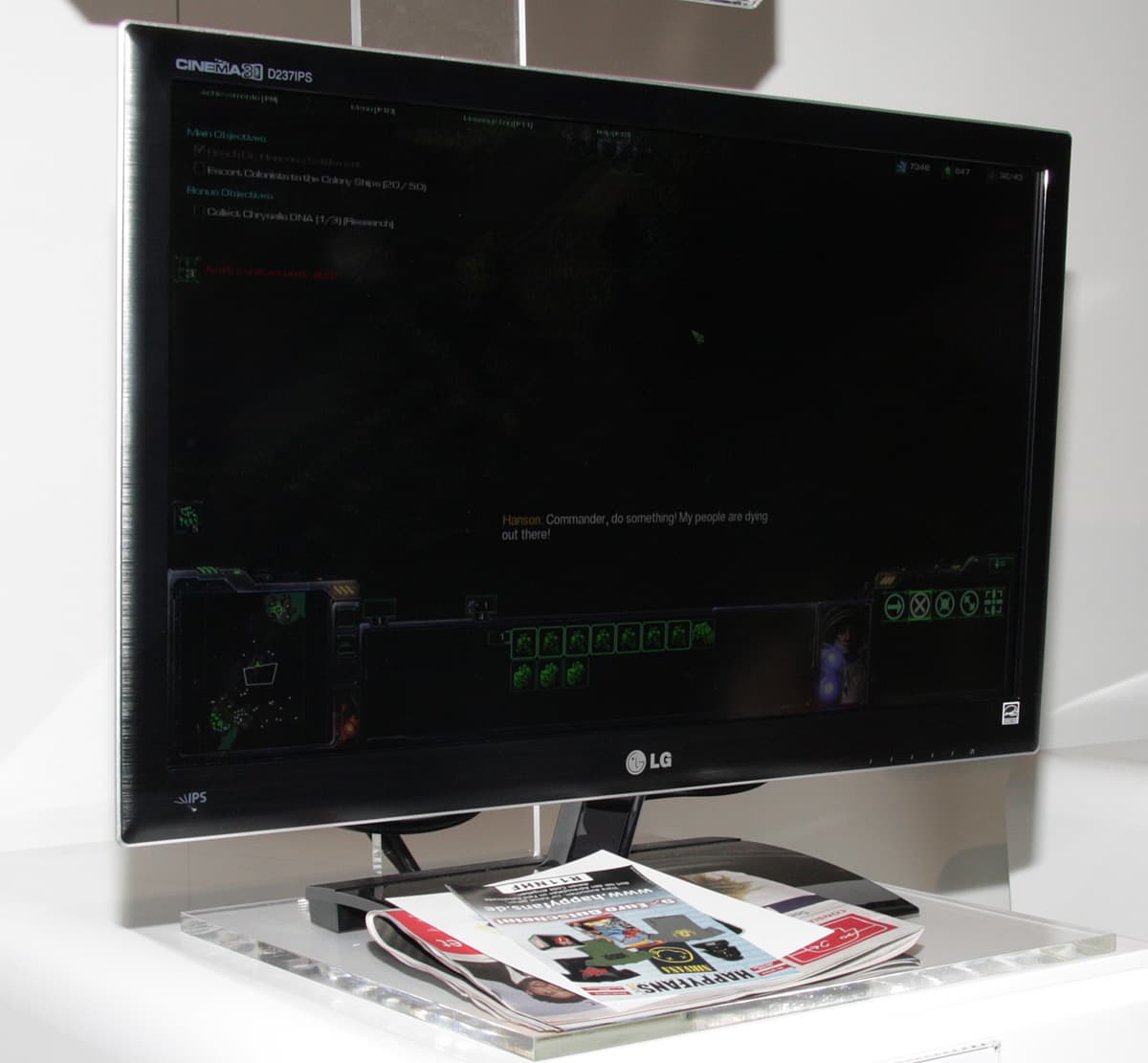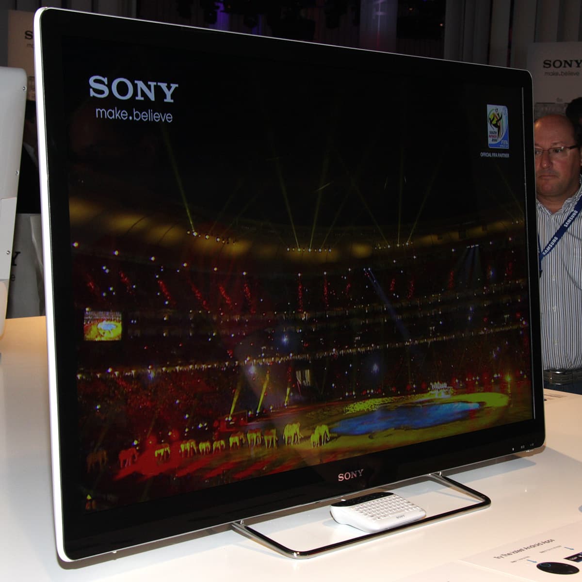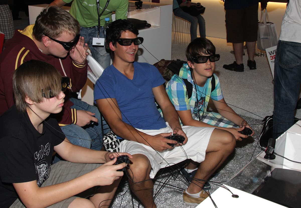 Большинство посетителей тут же вставали как вкопанные, разевали рты и замирали на несколько минут. Прямое доказательство того, что размер имеет значение. Оправившись от шока, посетители шли дальше. При этом очки оставались на месте, на носу, так как по всему павильону LG были равномерно размещены телевизоры и мониторы, а в темном закутке и проектор, демонстрирующие 3D-картинку. Компания явно сделала основную ставку на использование поляризации для разделения ракурсов и, соответственно, на пассивные очки (метод последовательного вывода кадров остался только в плазменных телевизорах). В случае телевизоров и мониторов используется чересстрочная поляризация, в случае проекторов одновременно на экран, сохраняющий поляризацию при отражении, проецируется два изображения. Основными недостатками такого способа являются небольшие, но все же видимые перекрестные помехи, в случае дисплеев — снижение разрешения по вертикали в два раза, видимая чересстрочная структура картинки и увеличение перекрестных помех при отклонении вверх или вниз от перпендикуляра к экрану. Но и плюсы, в сравнении с затворным способом, очень весомые — меньшее напряжение для глаз, сохранение стереоскопического эффекта даже при относительно быстрых движениях, а также легкие и дешевые очки без какой-либо электроники и без источников питания.
