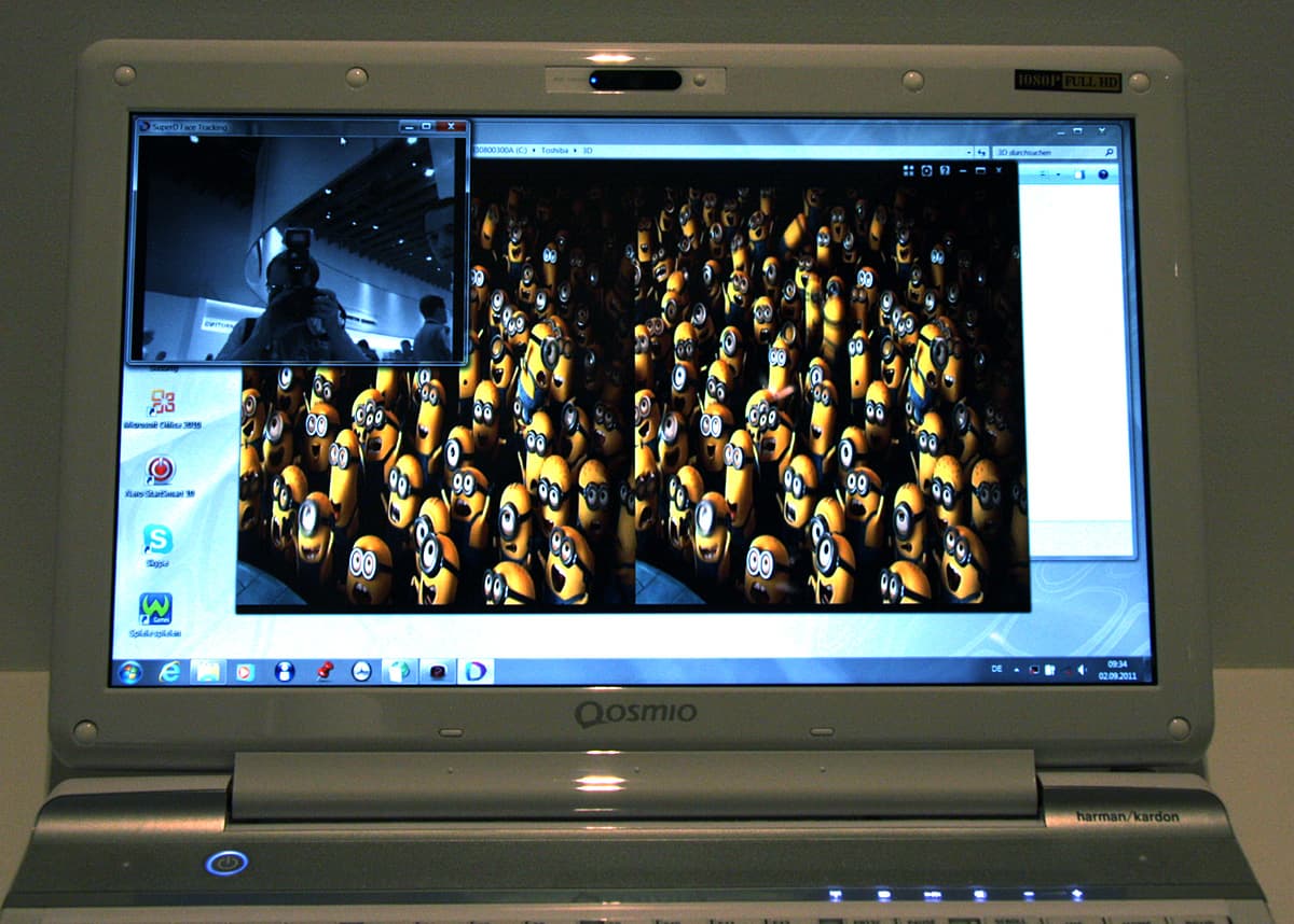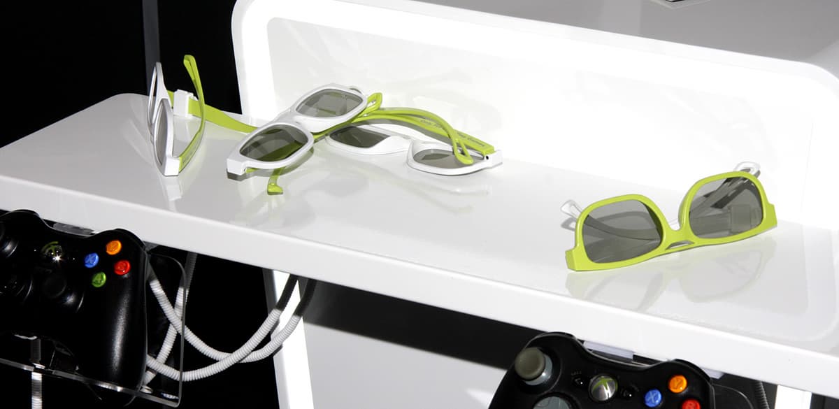 3D от Toshiba было представлено тремя технологиями — затворной, пассивной поляризационной и на эффекте барьера параллакса. Активные очки требовались для просмотра стереоскопического изображения на ноутбуке Qosmio X770 3D, поддерживающим NVIDIA 3D Vision,