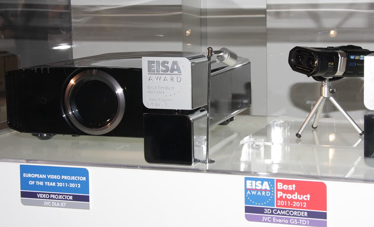 JVC устраивала закрытый показ новых проекторов, где фотографировать было запрещено (что не помешало появиться в сети фотографиям с той же презентации), поэтому ограничимся героями, уже заслужившими награды: проектором JVC X7 и 3D-видеокамерой JVC GS-TD1. Первый показывает в 3D, вторая снимает.