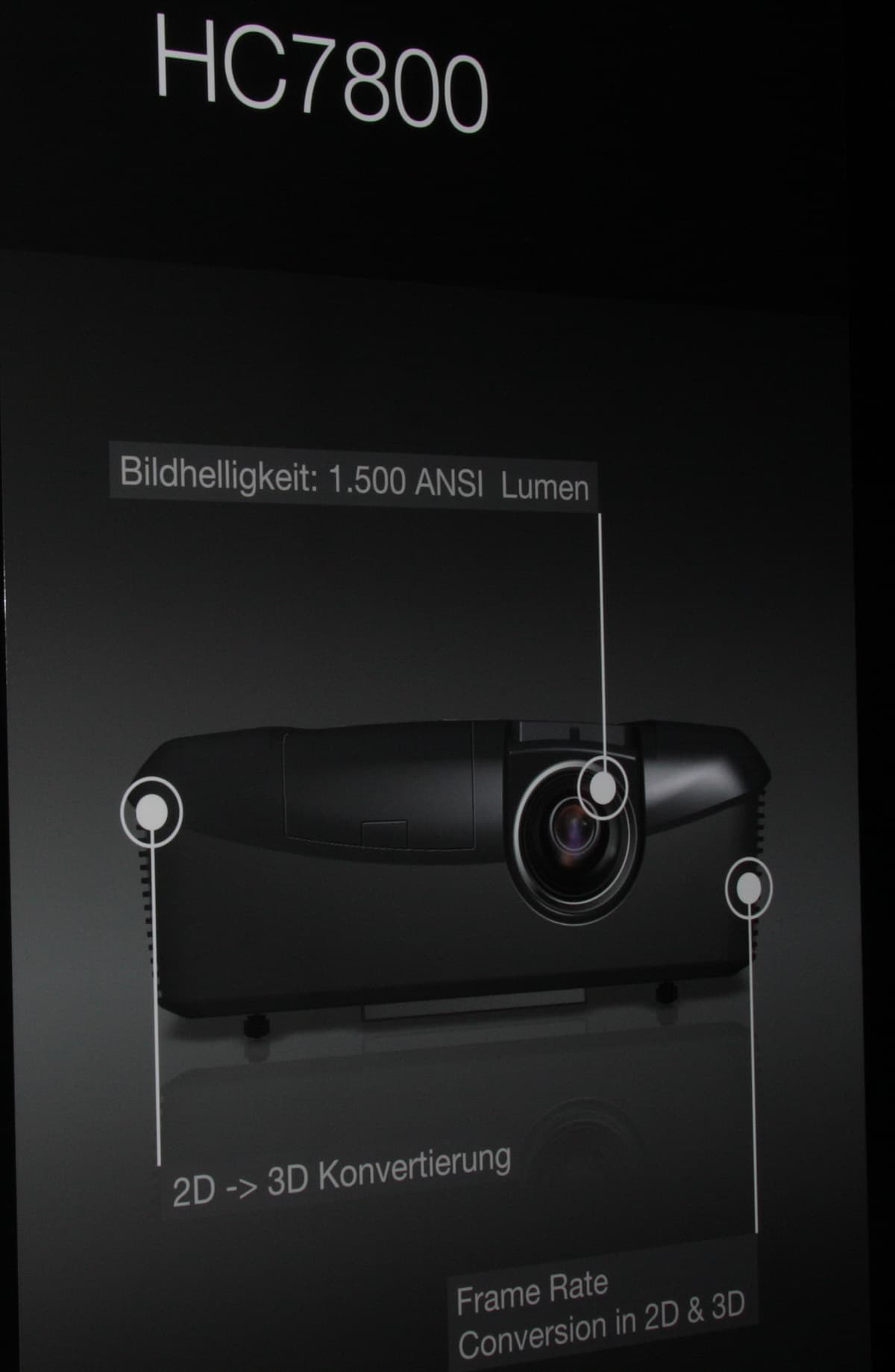 На больших экранах стереоскопическое изображение демонстрировали DLP-проекторы H9500BD (1920x1080, контрастность 50 000:1 (видимо, динамическая), световой поток 2000 лм, HDMI 1.4, вставка кадров и сдвиг объектива — прототип мы помним, вот только цвет нужно было оставить черным)