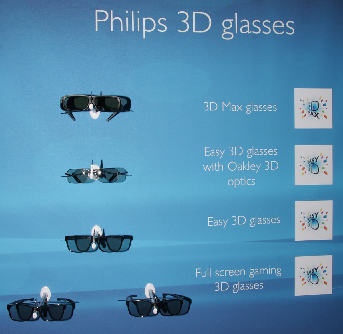 Компания Philips продолжает развивать тему 3D. В ее телевизорах используется как система с активными очками (серии 8000, 9000 Smart LED TV и Cinema 21:9 Platinum), обозначаемая 3D Max, так и технология с пассивными поляризационными очками (в сериях 7000 Smart LED TV, DesignLine Edge Smart LED TV и Cinema 21:9 Gold Smart LED TV) с названием Easy 3D. Такое разнообразие обуславливает и несколько моделей очков: