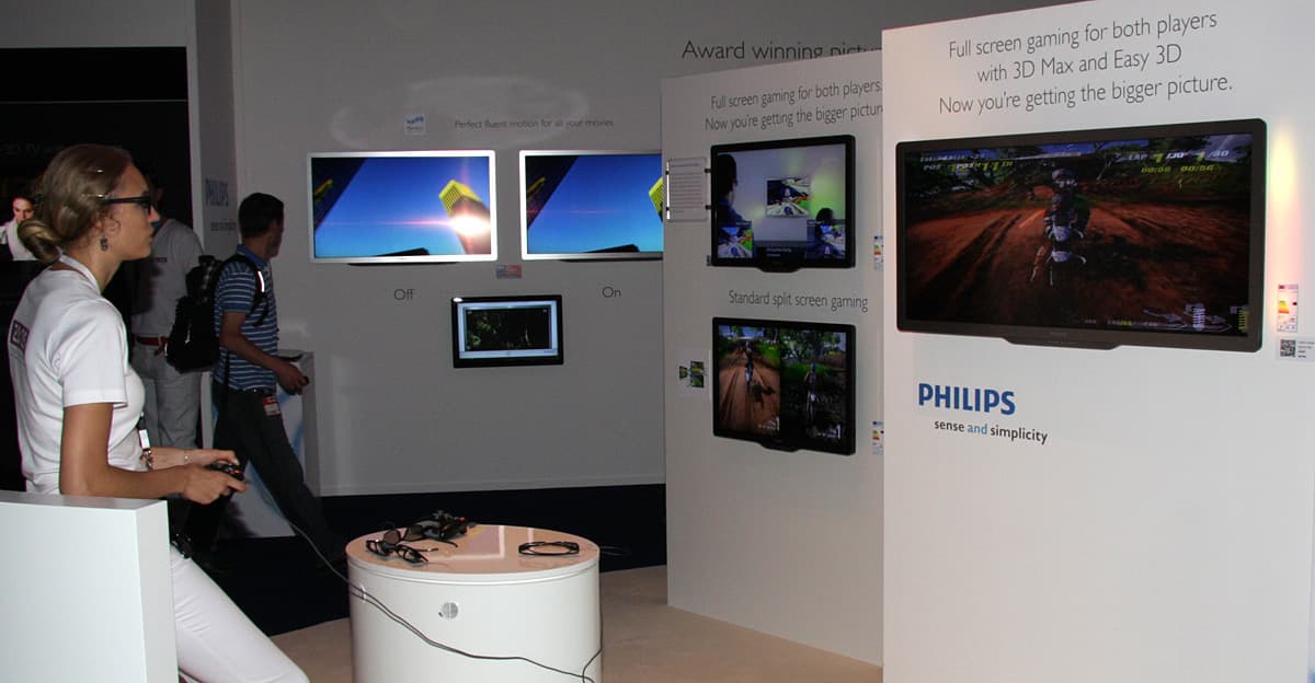 3D-телевизоры Philips, несмотря на различие в технологиях, поддерживают режим полноэкранного изображения для двух игроков. В случае с пассивными очками придется покупать по паре для каждого игрока, активные очки, видимо, как-то переключаются в нужный режим. (Хотя, конечно, играть в режиме стробоскопа с частотой 60 Гц мало кому понравится. Видимо поэтому на стенде демонстрировался только вариант с пассивными очками.)