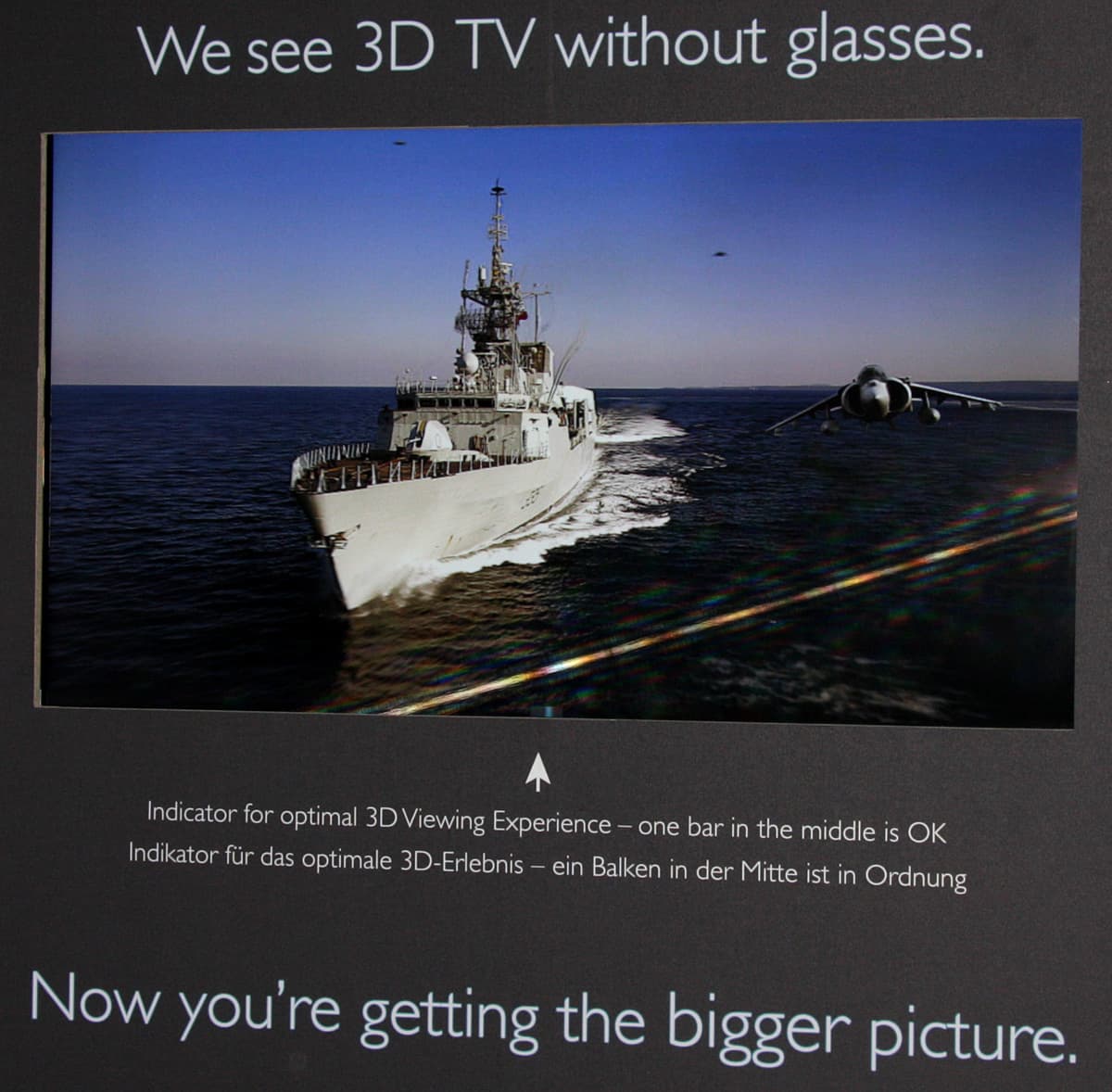 Также в павильоне Philips был замечен 3D-телевизор, использующий эффекта барьера параллакса, то есть не требующий очков для просмотра стереоскопического изображения. Самое примечательное в этом телевизоре — это маленькое окошко внизу по центру. Когда зритель находится в оптимальном для просмотра 3D месте, то в окошке видно одну голубоватую полоску.