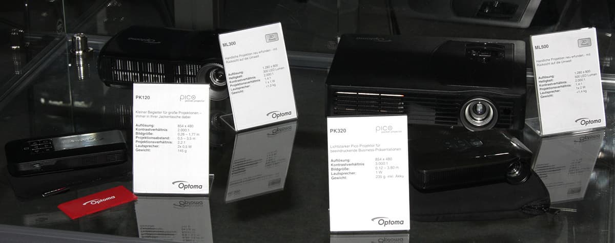 Пикопроекторы PK120 (854×480, 145 г) и PR320 (854×480, 235 г). Эти проекторы работают до 1,5 часа от встроенной батареи, световой поток производитель не указывает. А также два проектора с разрешением 1280×800 и со световым потоком в 300 лм — ML300 (1 кг) — и 500 лм — ML500 (1,4 кг).