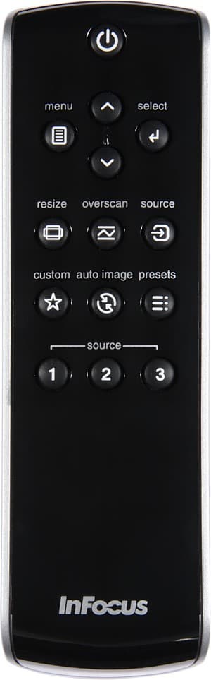 Пульт такой же, как и у проекторов серии IN8x. Он небольшой, удобно лежит в руке, сверху — глянцево-черный, снизу — серебристый. Несколько одинаково круглых кнопочек имеют крупные контрастные значки и мелкие подписи. Есть светодиодная достаточно яркая подсветка, включающаяся кнопкой снизу.