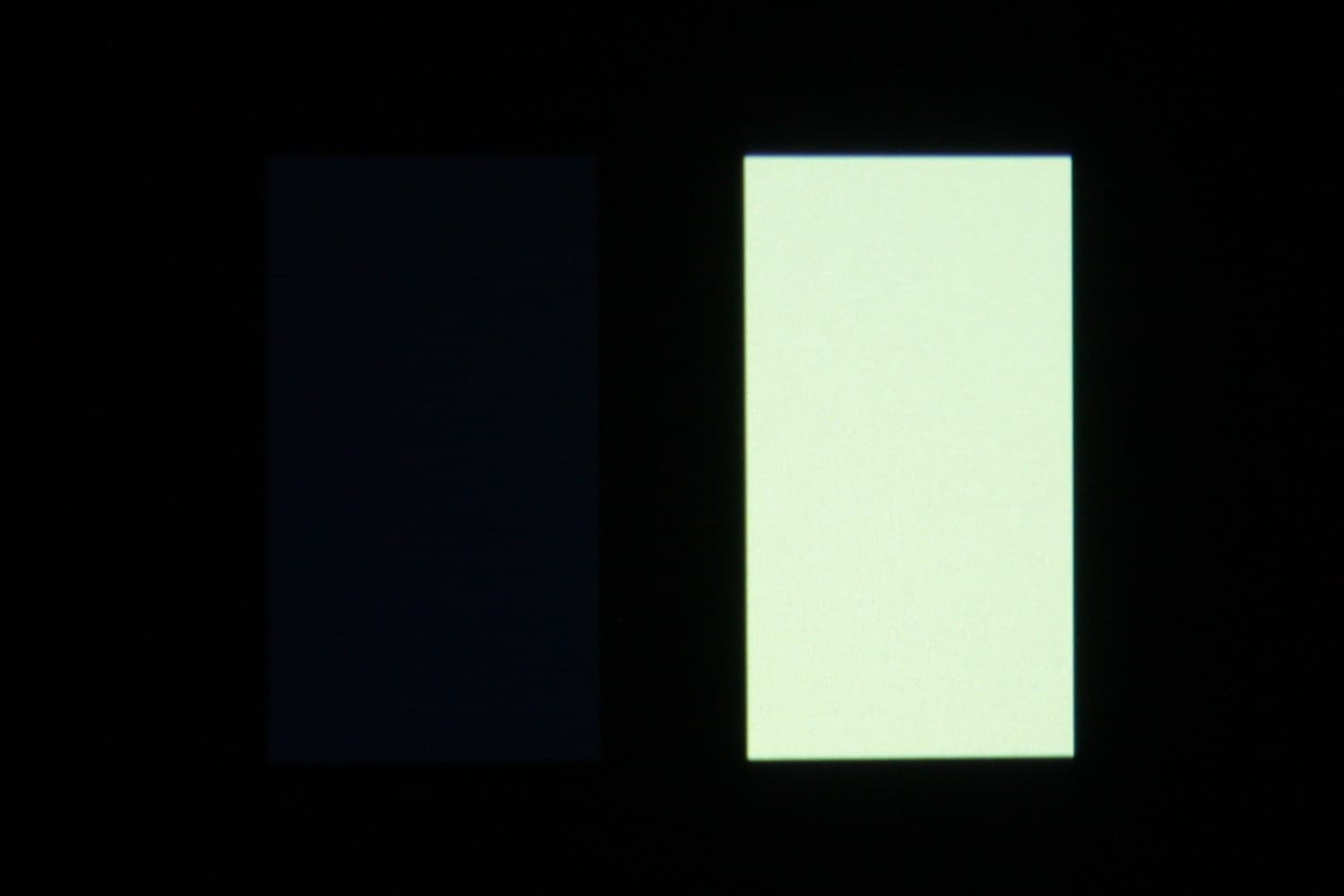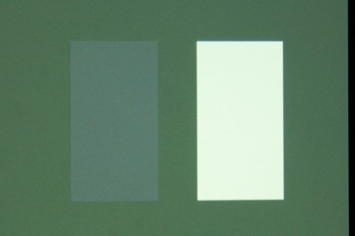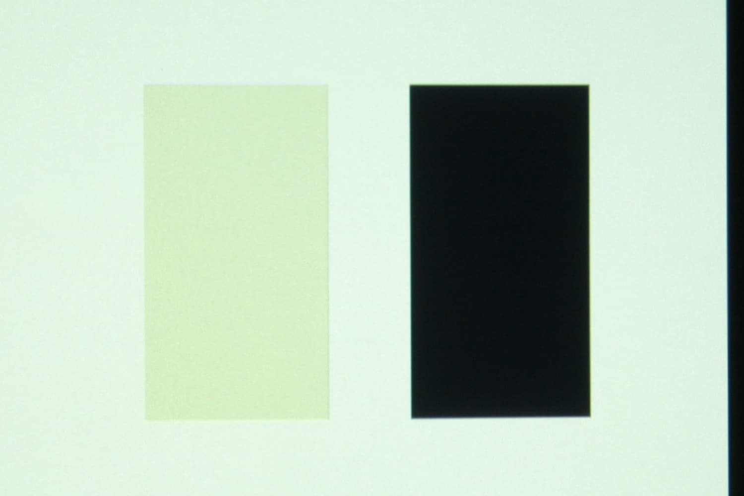 Для тестирования эффективности разделения для глаз мы вывели три тестовых изображения с черным прямоугольником на белом фоне, с белым прямоугольником на черном фоне и со светло серым прямоугольником на темно-сером фоне. В стереопарах прямоугольники были смещены относительно друг друга, поэтому при просмотре через очки при 100% разделении можно было бы видеть только один прямоугольник. Фотографии ниже сделаны через очки, при этом экспозиция подбиралась так, чтобы белое поле на фотографиях было максимально ярким, но еще не пересвеченным. Проверялись три режима Full HD — 60p, 50p и 24p. Вывод — в режиме Side by Side, кроме 24p, для которого использовался Top and Bottom, так как Side by Side не работал.
