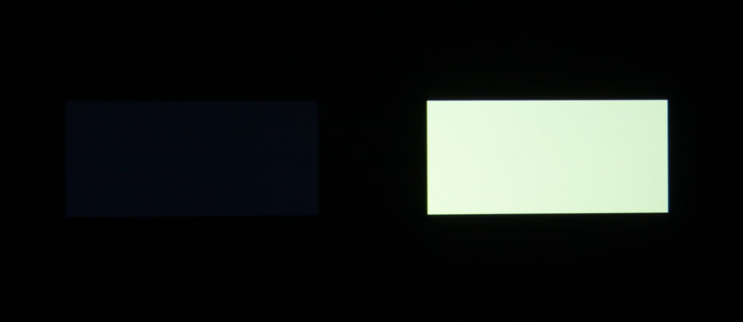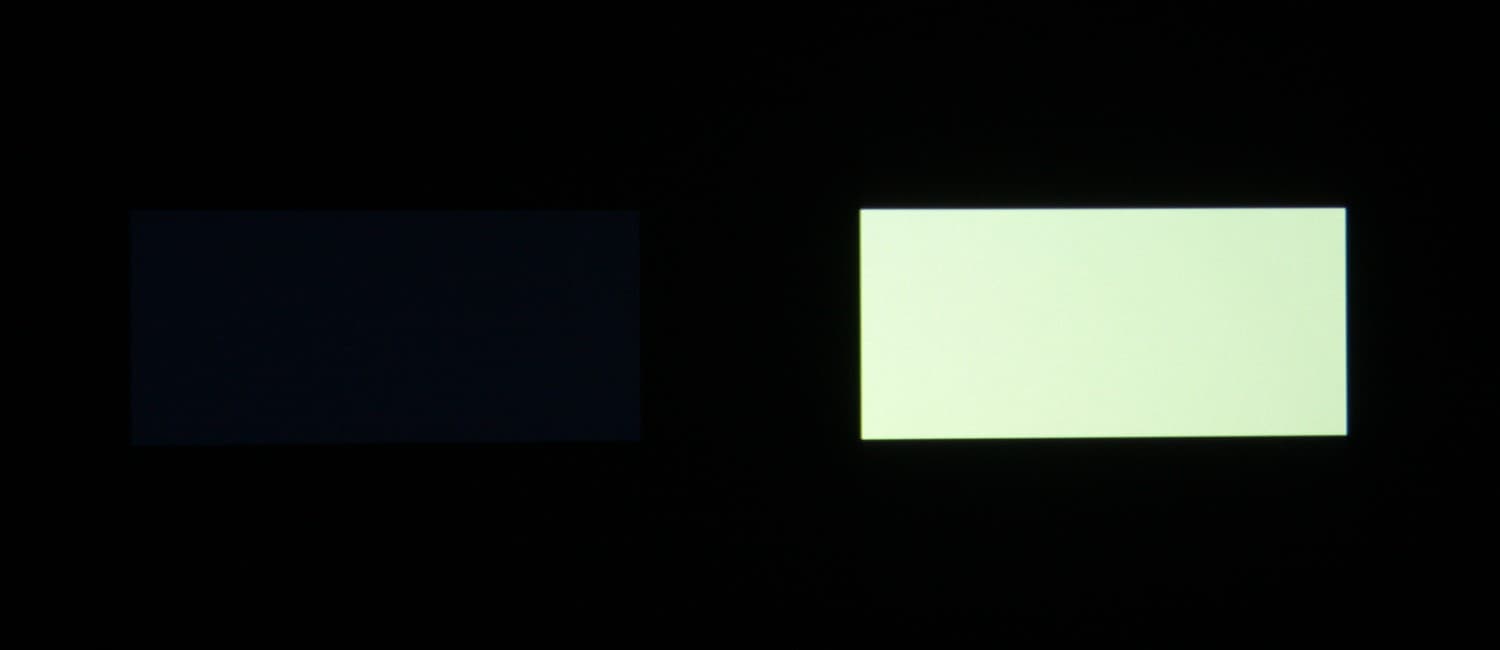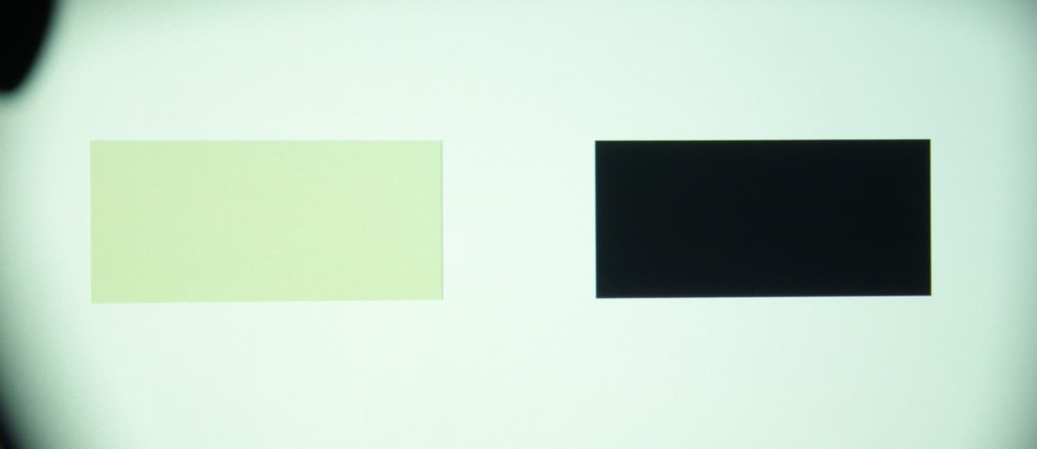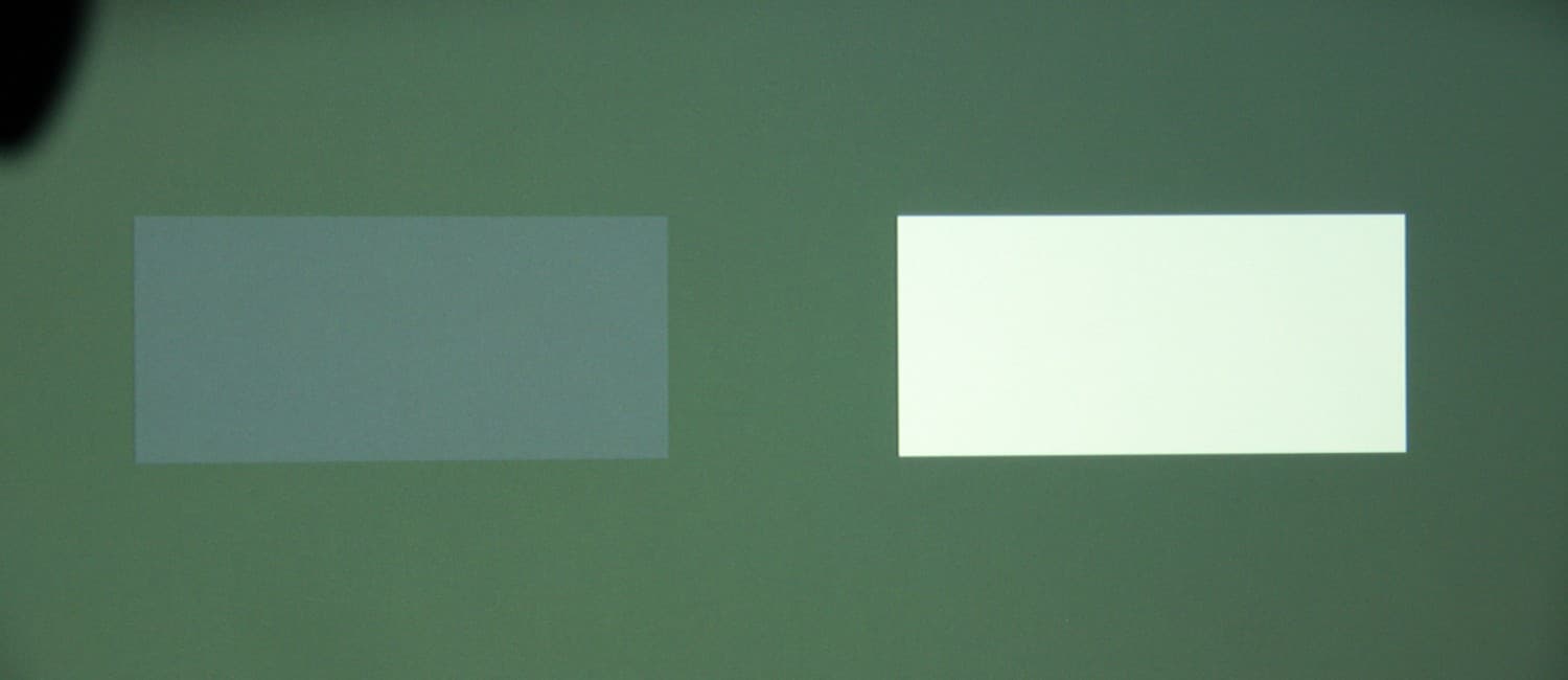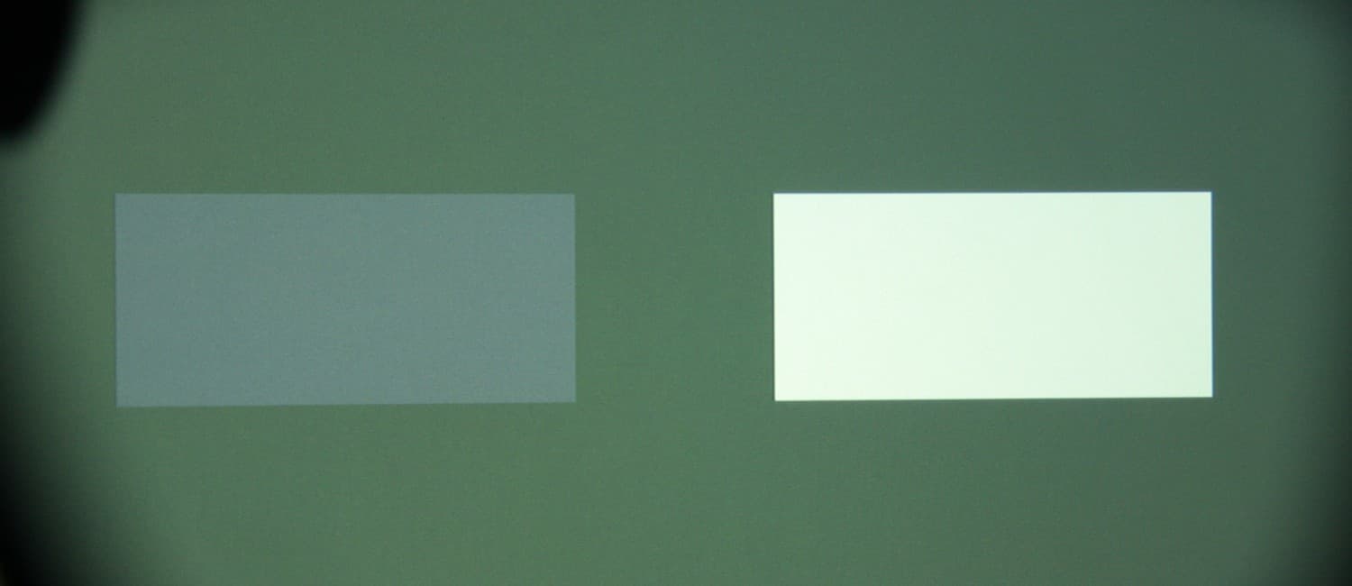 Максимальный световой поток соответствует паспортному значению (заявлено 1300 лм). Равномерность освещенности очень хорошая. Контрастность высокая. Также мы измерили контрастность, измеряя освещенность в центре экрана для белого и черного поля, т.н. контрастность full on/full off.