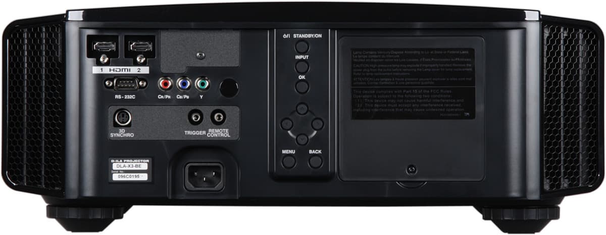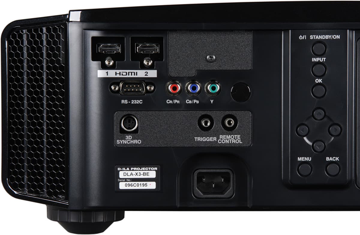 Проектор оснащен двумя HDMI-интерфейсами версии 1.4a и компонентным входом. К компонентному входу можно подключать источники RGB-сигнала с синхронизацией в зеленом канале. Под HDMI-разъемами находятся втулки с резьбой, предназначенные для фиксации HDMI-кабелей с винтовыми зажимами. Переключение между источниками осуществляется перебором с помощью кнопки INPUT на корпусе проектора или непосредственно тремя кнопками на пульте, каждая на свой вход. Автоматического распознавания активного подключения нет. В том случае, если автоматическое определение параметров видеосигнала работает неверно, в меню можно принудительно указать некоторые характеристики видеосигналов (например, яркостный диапазон для HDMI). Проектор поддерживает управление по HDMI, видимо, все ограничено просто включением при включении подключенного источника сигнала. В зависимости от установок в меню на выход TRIGGER подается 12 В или при включении проектора, или при выборе анаморфного режима, или не подается вовсе. В первом случае этот выход может управлять экраном с электромеханическим приводом, во втором — приводом анаморфотного объектива. Проектором можно управлять по интерфейсу RS-232C, в руководстве приведены распайка разъема, характеристики протокола и команды. Есть разъем для подключения внешнего ИК-приемника. Разъем типа mini DIN 3 pin предназначен для подключения внешнего излучателя синхронизации стереоскопических очков.