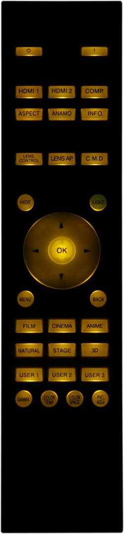 Еще есть два режима для работы с анаморфотным объективом-насадкой, один для формата 2,35:1, второй для 16:9. При подключении к компьютеру для разрешений меньше 1920 на 1080 пикселей можно выбирать из режимов с максимальным увеличением с сохранением пропорций, выводом без интерполяции и увеличением на всю область проекции. Дополняют режимы трансформации цифровой сдвиг изображения по горизонтали и по вертикали. С помощью этой функции можно, например, в режиме Увеличение сдвинуть изображение так, чтобы на экране поместились субтитры. Настройка Маскировка поможет избавиться от помех по периметру изображения. Она позволяет на 2,5 или 5% обрезать картинку по периметру или на указанное значение (от 0 до 5%) по всем четырем краям независимо. Подрезка выполняется без увеличения, а значит и без интерполяции. Вывод изображения временно приостанавливается кнопкой HIDE (при этом индикатор на корпусе мигает зеленым).