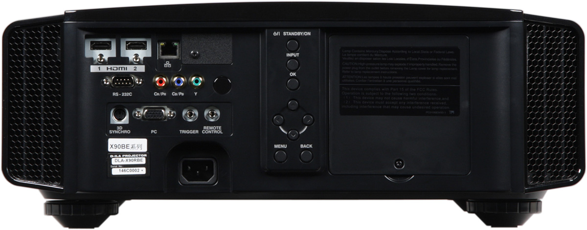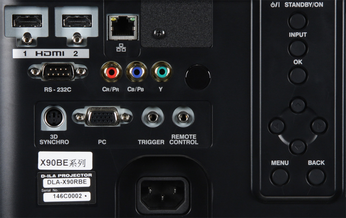Проектор оснащен двумя HDMI-интерфейсами версии 1.4a, входом VGA и компонентным входом. К компонентному входу можно подключать источники RGB-сигнала с синхронизацией в зеленом канале. Под HDMI-разъемами находятся втулки с резьбой, предназначенные для фиксации HDMI-кабелей с винтовыми зажимами. Переключение между источниками осуществляется перебором с помощью кнопки INPUT на корпусе проектора или непосредственно четырьмя кнопками на пульте, каждая на свой вход. Автоматического распознавания активного подключения нет. В том случае, если автоматическое определение параметров видеосигнала работает неверно, в меню можно принудительно указать некоторые характеристики видеосигналов (например, яркостный диапазон для HDMI). Проектор поддерживает управление по HDMI, видимо, все ограничено просто включением при включении подключенного источника сигнала. В зависимости от установок в меню на выход TRIGGER подается 12 В или при включении проектора, или при выборе анаморфного режима, или не подается вовсе.