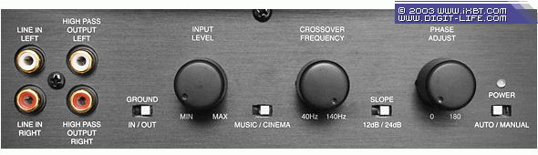 Разумеется, задняя панель абсолютно аналогична оной у PSW-2500. А значит по-прежнему присутствует непривычно большое количество настроек, позволяющих точно «вписать» звучание сабвуфера в любое помещение, а также согласовать сабвуфер с любыми АС. Несколько огорчает тот факт, что на регуляторе частоты среза не отмечено положение, при котором сабвуфер будет оптимально солгласовываться со своими же «родными» сателитами. Уж коли сабвуфер продаётся в комплекте с определёнными сателитами, то почему бы не облегчить покупателю процедуру согласования, как это делают многие компании в своих готовых наборах? Уж, казалось бы, вполне логичное пожелание: иметь пометку на регуляторе фильтра НЧ или ещё лучше — тумблер, позволяющий мгновенно выставить нужную частоту среза фильтра НЧ и крутизну спада. Ан нет, не предусмотрели этого разработчики. Ситуация усугубляется еще и тем, что на регуляторе фильтра НЧ промаркированы только крайние положения (40 и 140 Гц), поэтому процесс согласования сабвуфера со своими же штатными сателитами обещает быть довольно утомительным для неподготовленного пользователя, ведь отстраивать сабвуфер придётся только на слух.