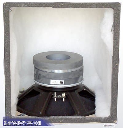 Внутреннее убранство вполне традиционно: стенки закрыты листами звукопоглотителя (синтепона), хотя, на самом деле, звукопоглотитель заполняет почти весь внутренний объём корпуса, просто на время съёмки мы были вынуждены извлечь какую-то часть, а то динамика не было видно совсем :)