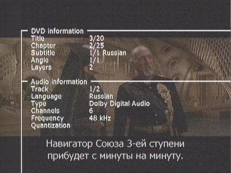Под руку подвернулся DVD диск «Дюна». Ну чтож, вставляем диск. Загружается довольно быстро, сразу запускается воспроизведение. Качество картинки отменное, никаких претензий. Перемотка со скоростью от 8-х до 48-х, хороший звук. При помощи кнопки SETUP можем получить информацию о диске. Русские субтитры отображаются нормально.