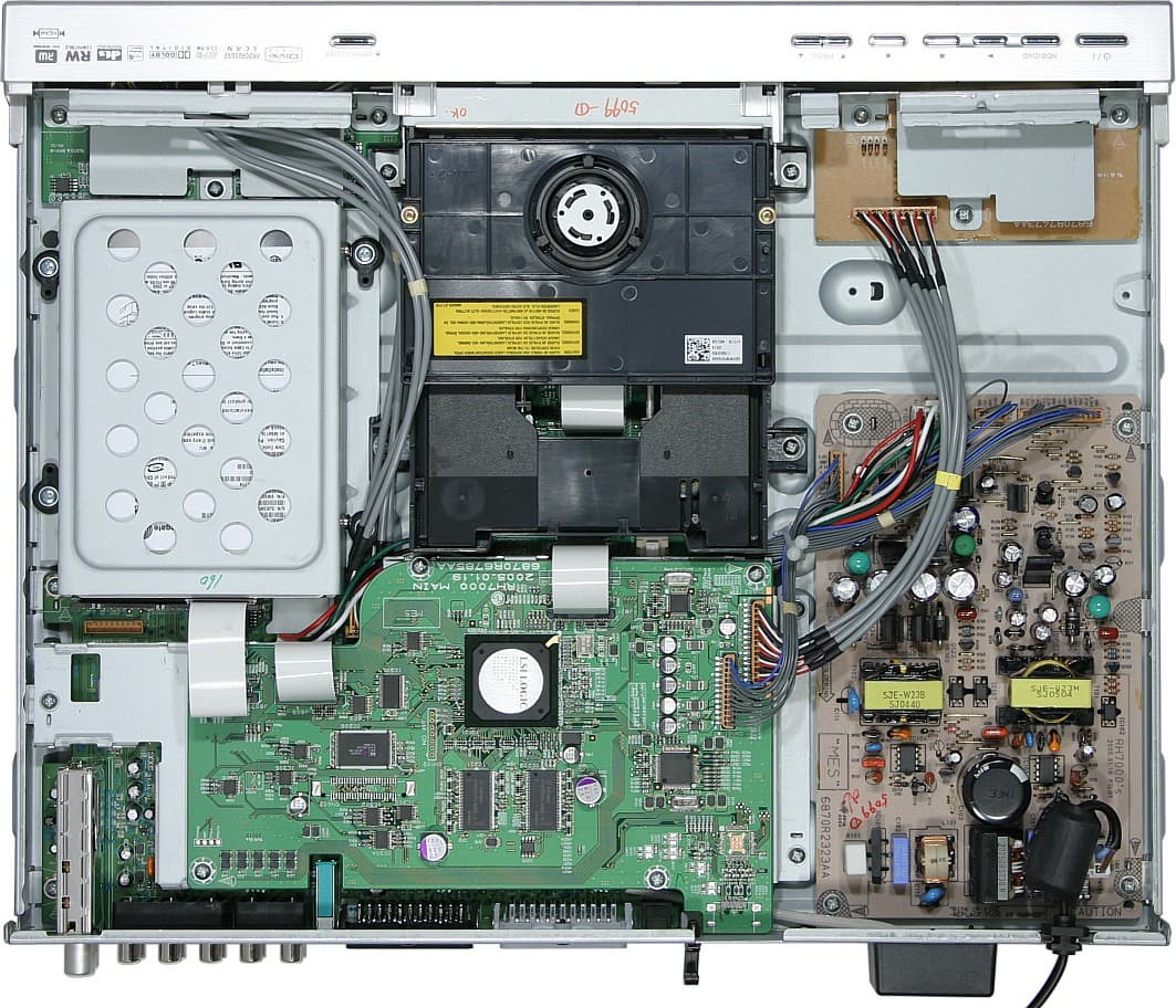 Одной микросхемой дело не ограничивается, их еще много. Перечислим некоторые, непосредственно определяющие функциональность и качество: мультистандартный видеодекодер TVP5146, аудиопроцессор MSP3417G от Micronas, декодирующий NICAM-звук, двухканальные аудиоАЦП CS5340 (THD+N = - 94 дБ) и аудиоЦАП CS4351 (192 кГц/24 бит, THD+N = -100 дБ). ВидеоЦАПы встроены в DMN-8652, а усиливает мощность аналоговых видеосигналов чип BH7868FS, в который встроены фильтры высоких частот. Микросхема SDA 5650X предназначена для извлечения кодов PDC/VPS, что, в принципе, позволяет узнать текущее число, точное время, название ТВ-канала и передачи и точное время начала заданной программы. К сожалению, или в рекордере эти функции заблокированы, или российское телевещание не утруждает себя передачей дополнительной информации, или и то, и другое. Из больших микросхем неопознанной осталась микросхема с маркировкой RH7000P. Вероятно, это заказная микросхема, встраиваемая во все рекордеры от LG, относящиеся к 7000-ой серии.
