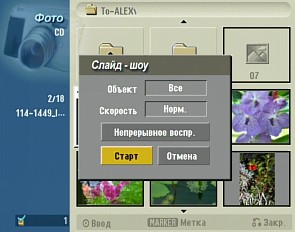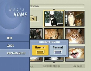 Данные о поддерживаемых носителях и типах файлов приведены в таблицах. Специальная кнопка HOME выводит на экран меню, где можно выбрать нужный носитель (винчестер, оптический диск или карта памяти) и тип мультимедийного контента.