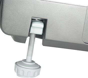 Две передние пластмассовые ножки регулируются по высоте и фиксируются кнопками по бокам, задние тоже регулируются, но в меньшем диапазоне и простым выкручиванием.