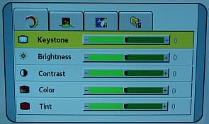 Экранное меню очень простое, понятное. Навигация осуществляется с помощью всего четырех кнопок в верхней части пульта или на корпусе проектора (кнопки MENU, EXIT и вправо-влево). Настроек минимум. Меню нерусифицировано.