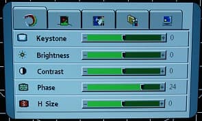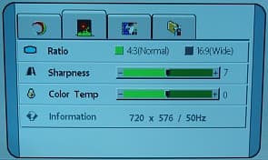Меню небогато настройками изображения. Настраиваются яркость, контрастность, цветовая температура (от -10 до 10 у.е.). Когда источником изображения не является компьютер, добавляются регулировки насыщенности и оттенка, а в случае композитного и S-Video-подключения еще и контурной резкости.