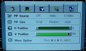 Для быстрого переключения между режимами на пульте есть кнопка RATIO. Нажатие на кнопку FREEZE на пульте «замораживает» а на кнопку BLANK выключает изображение. Кнопка-качалка ZOOM служит для цифрового увеличения изображения. В проекторе реализована довольно продвинутая функция картинка в картинке. Поверх изображения с компьютера может быть отображено видеоизображение с композитного или S-Video-входа. Настраивается не только источник изображения, но также размер, положение, яркость, контрастность и другие параметры дополнительного окна. Все это можно сделать через меню, а быстрый доступ к некоторым параметрам привязан к трем кнопкам пульта — PIP Source, PIP Pos. и PIP Size.