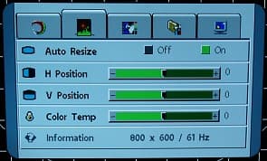 Автоподстройка под VGA-сигнал всегда включена, работает быстро и правильно. Внешний монитор подключаются к выходу COMPUTER OUT.