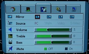 Шум от системы вентиляции небольшой, но его спектр такой, что при длительном нахождении рядом с проектором жужжание вентиляторов начинает раздражать. Конечно, если не заглушается саундтреком. Динамик довольно громкий, а искажения умеренные. В меню не только настраивается громкость (на пульте есть кнопка-качалка VOL.), но и уровень верхних и низких частот (при таком качестве звука это явно ненужные опции).