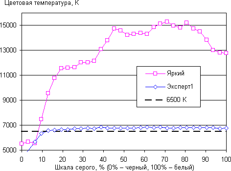Близкий к черному диапазон можно не учитывать, так как в нем цветопередача не так важна, а погрешность измерения цветовых характеристик высокая. Видно, что в режиме Яркий цветопередача не является приоритетом, так как цветовая температура слишком высокая на белом и сильно изменяется от оттенка к оттенку. Тогда как в режиме Эксперт1 цветовой баланс приходит в норму: ΔE ниже 10 и цветовая температура несущественно выше 6500 К, при цветовая температура мало изменяется на всей имеющей значение части шкалы серого, что благоприятно сказывается на субъективном восприятии цветового баланса.