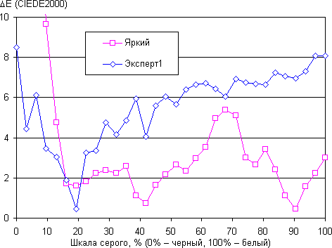 Графики ниже показывают цветовую температуру на различных участках шкалы серого и отклонение от спектра абсолютно черного тела (параметр ΔE) для самого яркого режима (Яркий) и для режима Эксперт1: