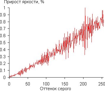 Для оценки характера роста яркости на шкале серого мы измерили яркость 256 оттенков серого (от 0, 0, 0 до 255, 255, 255) при Гамма = 2.2. График ниже показывает прирост (не абсолютное значение!) яркости между соседними полутонами: