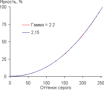 Аппроксимация полученной по 256 точкам гамма-кривой дала значение показателя 2,15, что чуть меньше стандартного значения 2,2, при этом аппроксимирующая функция практически совпала с реальной гамма-кривой: