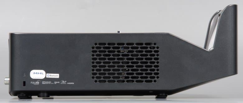 Проектор имеет необычную форму в виде вытянутого вдоль оси проекции бруска, тогда как обычно проекторы напоминают положенную на бок книжку. Корпус проектора изготовлен из пластика с темно-серым серебристым матовым покрытием (производитель называет этот цвет титановый черный). Покрытие не маркое и относительно устойчивое к появлению царапин. Воздух для охлаждения внутренностей забирается через решетки на правом и на левом боках и выдувается вперед через фронтальную решетку. Фронтальной частью мы называем панель корпуса, обращенную к экрану.
