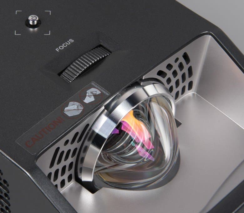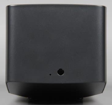 За боковыми решетками находятся по одному небольшому громкоговорителю, каждый в своем боксе, окруженном демпфирующими прокладками из мягкого пористого материала. За передней решеткой можно разглядеть два небольших вентилятора, работающих на выдув. Под решеткой расположены один из двух разъемов HDMI (который с поддержкой MHL), разъем питания и антенный вход. Отметим, что решетка и разъемы на передней панели исключают вариант проекции на стол вертикально вниз, когда проектор просто стоит вертикально на столе. А жаль. На задней панели (она обращена к зрителю с пультом в руке) находится окошко единственного ИК-приемника и крошечный индикатор состояния, который неярко светится красным в режиме ожидания. На правом боку расположены остальные интерфейсные разъемы, а на левом - разъем для кенсингтонского замка. Пятипозиционный джойстик (нажатие и отклонение в четыре стороны) находится примерно по центру на верхней панели. Позади него выступает из корпуса ребристое колесо фокусировки.
