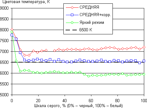 Графики ниже показывают цветовую температуру на различных участках шкалы серого и отклонение от спектра абсолютно черного тела (параметр ΔE) для самого яркого режима (нет коррекции и включен BrilliantColor), для режима с коррекцией цветопередачи (BrilliantColor = ВЫКЛ. (или 0), ЦВЕТ. ТЕМП. = СРЕДНЯЯ) и после ручной подстройки смещения и усиления трех основных цветов. Для отсутствующих на графиках точек расчет параметров выдавал ошибку переполнения. Близкий к черному диапазон можно не учитывать, так как в нем цветопередача не так важна, а погрешность измерения цветовых характеристик высокая.