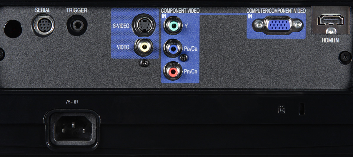 Вход с разъемом mini D-sub 15 pin совместим как с компьютерными VGA-сигналами, так и с компонентными цветоразностными, и со SCART-RGBS-сигналами. Переключение между источниками осуществляется с помощью двух кнопок на корпусе (с разбивкой на две группы) или с помощью пяти кнопок на пульте (по одной на каждый вход). Автоматического поиска активного входа, по всей видимости, нет. Экран с электромеханическим приводом или привод анаморфотной насадки можно подключить к выходу TRIGGER, режим работы которого задается в меню. Проектором можно дистанционно управлять по интерфейсу RS-232. С международного сайта компании-производителя можно скачать подробную инструкцию по использованию COM-порта (для HC4000 ее там нет, но, скорее всего, к нему подойдет от двух других).