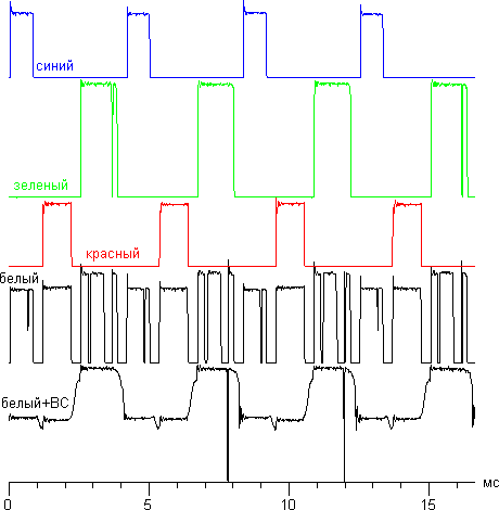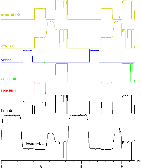 Записи изменения яркости от времени при выводе различных цветов позволяют построить нижеследующие графики: